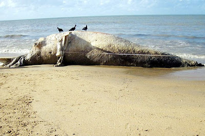“Uma baleia jubarte macho com 13 metros de comprimento e peso estimado de 35 a 40 toneladas foi encontrada morta, na praia de Barra Velha, em Nova Viçosa, litoral sul da Bahia.