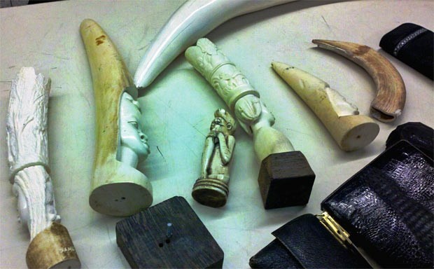 “Agentes da alfândega americana flagraram uma mulher de 63 anos que tentava entrar nos EUA, pelo Aeroporto de Los Angeles, com oito presas de marfim e sete bolsas feitas de couro de diferentes tipos de animais, entre eles elefante, crocodilo e arraia.