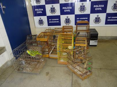 “Cardeais, papagaios e canários estão entre os pássaros apreendidos. Eles permanecem na delegacia da cidade até a manhã de quarta-feira, quando serão levados para o Ibama de Vitória da Conquista, cidade distante 140 km de Brumado.” – texto do portal Terra