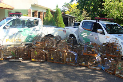 No total foram apreendidas 274 aves silvestres, dentre elas tucanos, jandaias da testa vermelha, papagaios verdadeiros, periquitos da asa amarela e maracanãs, tempera-viola, sanhaços, azulões, sabiás, curiós, trincas ferro, tico-tico rei, canários da terra e outras diversas, além de 36 anilhas SOSP e Ibama adulteradas periciadas.” – texto da matéria “Polícia Ambiental apreende 274 aves e lavra multas de R$ 190 mil”, publicada em 9 de dezembro de 2012 pelo jornal O Regional (Catanduva –SP)