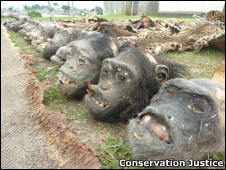 Não tinha como deixar de escrever sobre o que li hoje em alguns sites que noticiaram a apreensão, no Gabão, de cabeças e mãos de chimpanzés e um gorila, além de peles de leopardos, leão, couros de cobra e rabos de elefantes. Resultado de uma operação das autoridades daquele país africano, o “material” apreendido seria consequência do hábito de comunidades em se alimentarem de carne de animais silvestres e de utilizarem partes dos espécimes (como as cabeças e as mãos) em rituais de magia, como amuletos de boa sorte ou na medician tradicional.