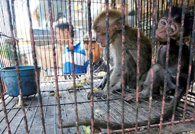 “Abatidos e presos em uma gaiola, dois animais do gênero de primatas Macaca fascicularis, foram vistos nesta sexta-feira (6/7) no mercado de animais selvagens de Medan, na Indonésia.